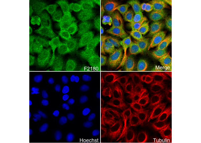 • Immunofluorescent analysis of A549 cells using F2180 (green, 1:250), Hoechst (blue) and tubulin (Red).