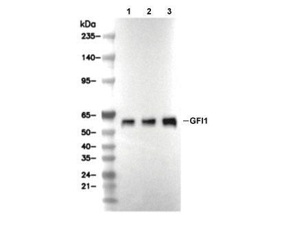 GFI1 Antibody [M16D23] detects endogenous levels of total GFI1 protein.