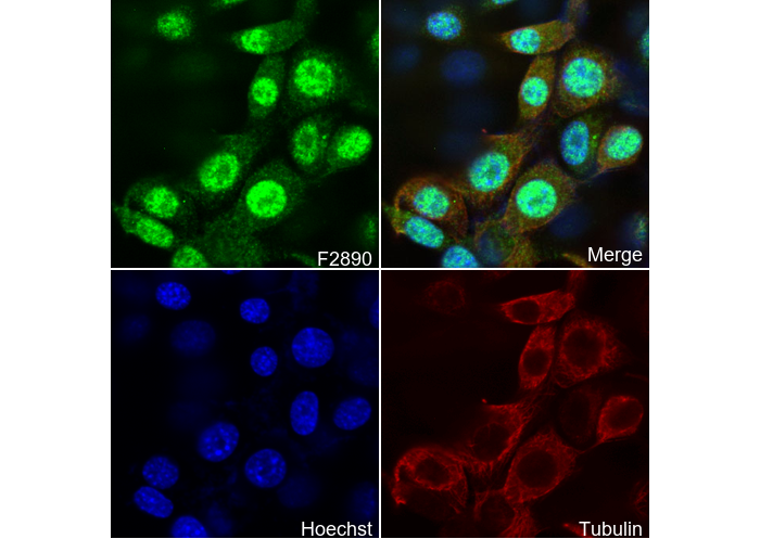 • Immunofluorescent analysis of NIH/3T3 cells (GFP-transfected) using F2890 (green, 1:500), Hoechst (blue) and tubulin (Red).