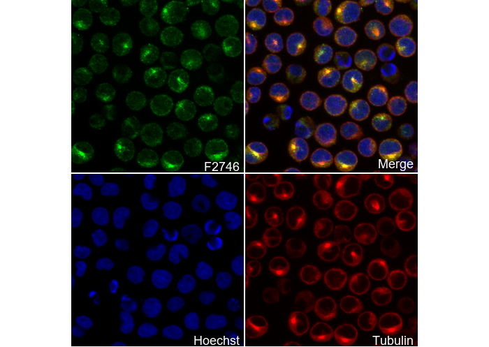 • Immunofluorescent analysis of Ramos cells using F2746 (green, 1:2000), Hoechst (blue) and tubulin (Red).