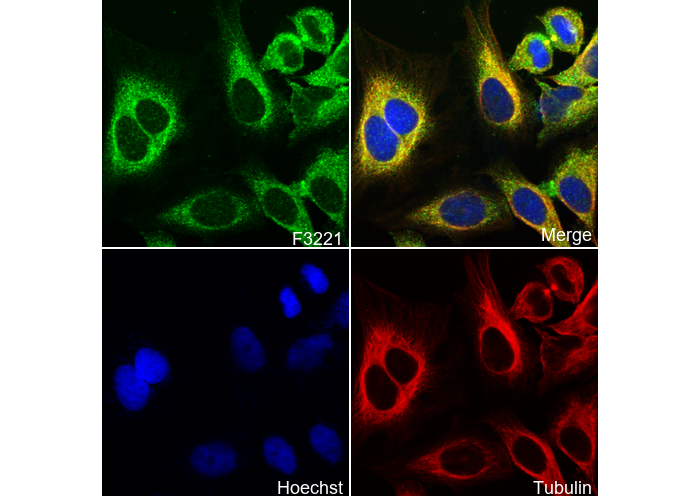 • Immunofluorescent analysis of Hela cells using F3221 (green, 1:2000), Hoechst (blue) and tubulin (Red).