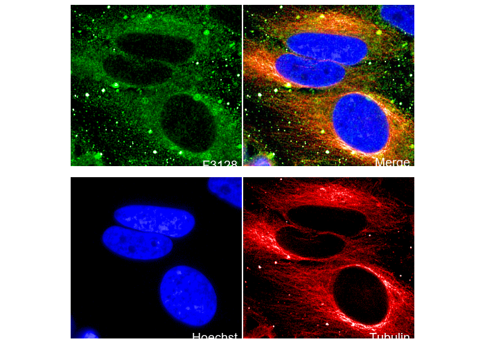 • Immunofluorescent analysis of Hela cells using F3128 (green, 1:400), Hoechst (blue) and tubulin (Red).