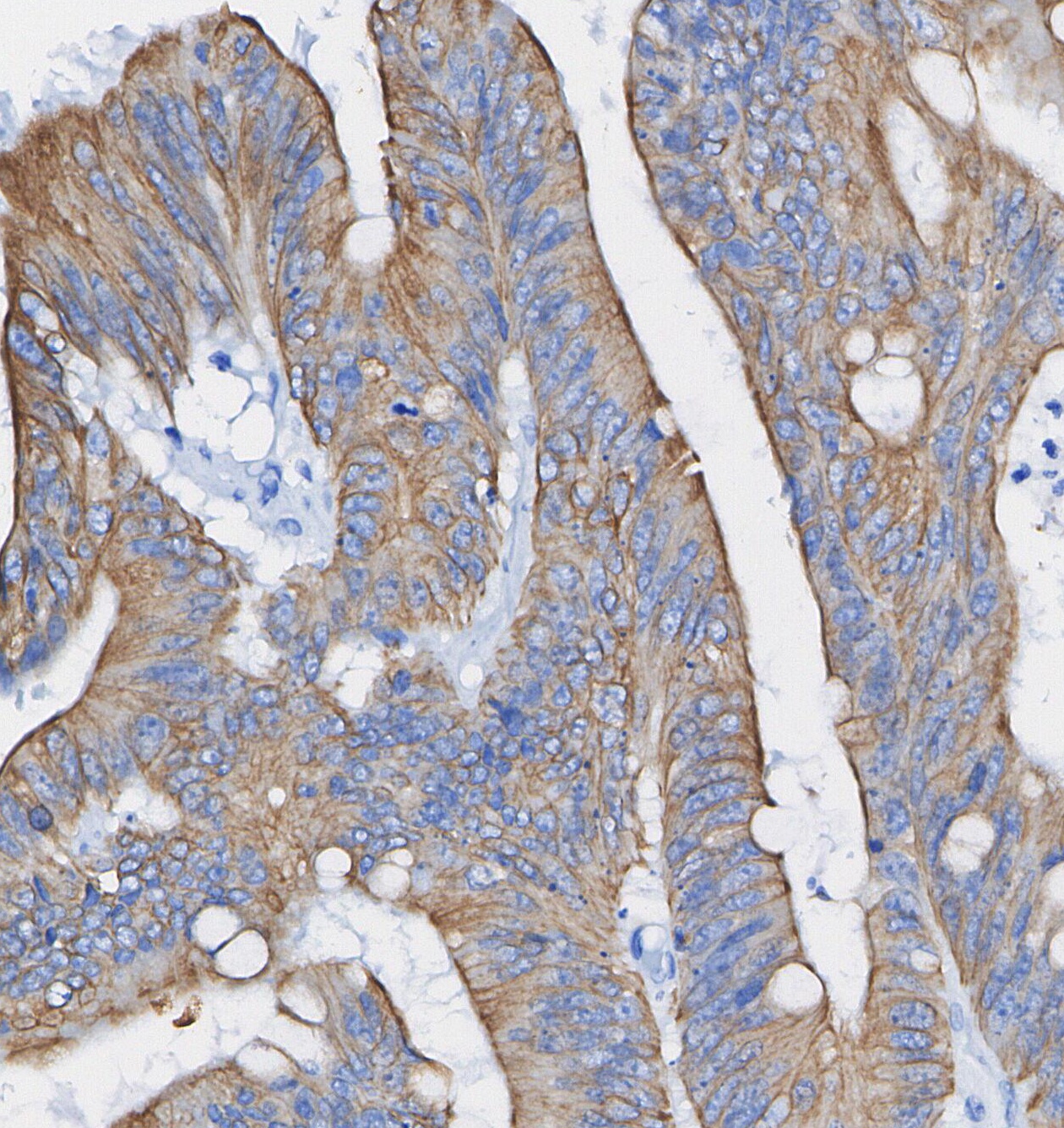 • Immunohistochemical analysis of formalin fixed paraffin embedded human Colorectal cancer tissue with F2228 at 1/100 dilution.