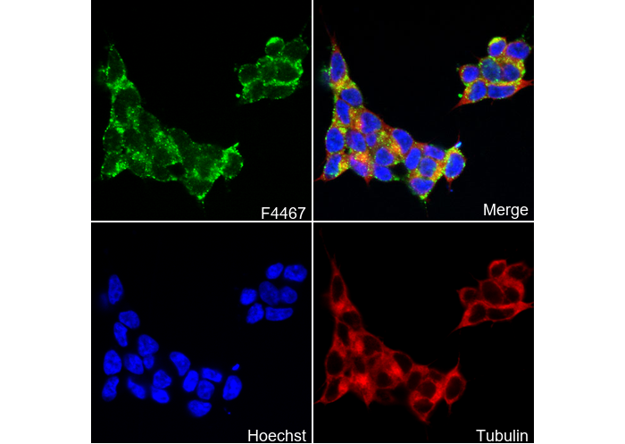 • Immunofluorescent analysis of SH-SY5Y cells using F4467 (green, 1:50), Hoechst (blue) and tubulin (Red).