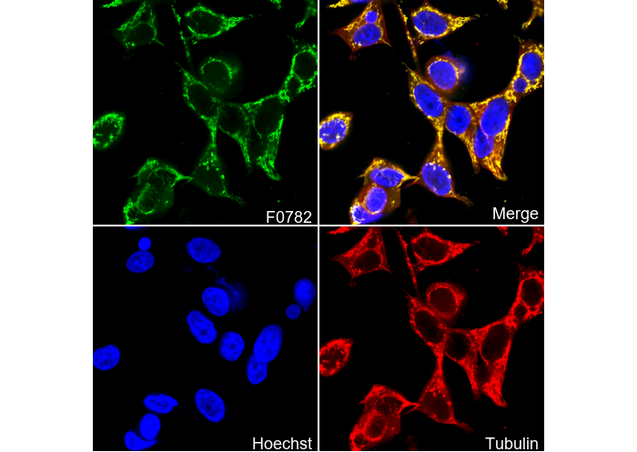 • Immunofluorescent analysis of MCF-7 cells using F0782 (green, 1:100), Hoechst (blue) and tubulin (Red).