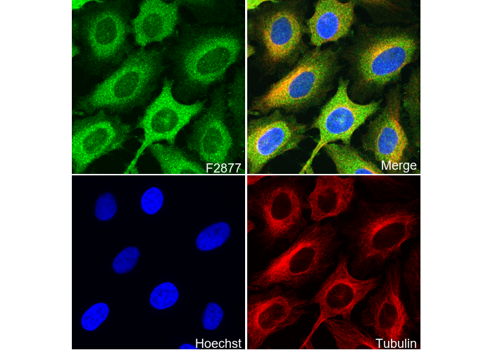 • Immunofluorescent analysis of Hela cells using F2877 (green, 1:150), Hoechst (blue) and tubulin (Red).