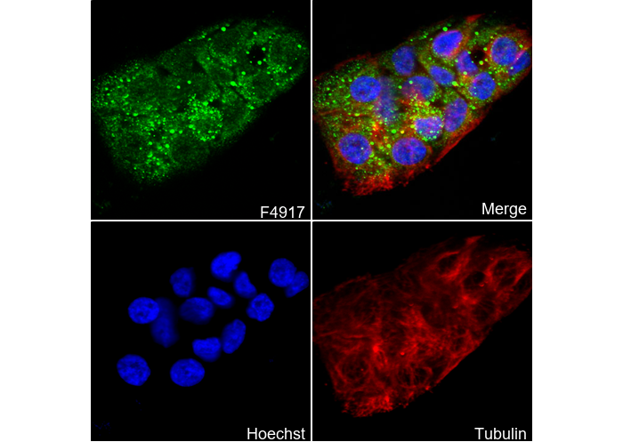 • Immunofluorescent analysis of NCI-H441 cells using F4917 (green, 1:50), Hoechst (blue) and tubulin (Red).