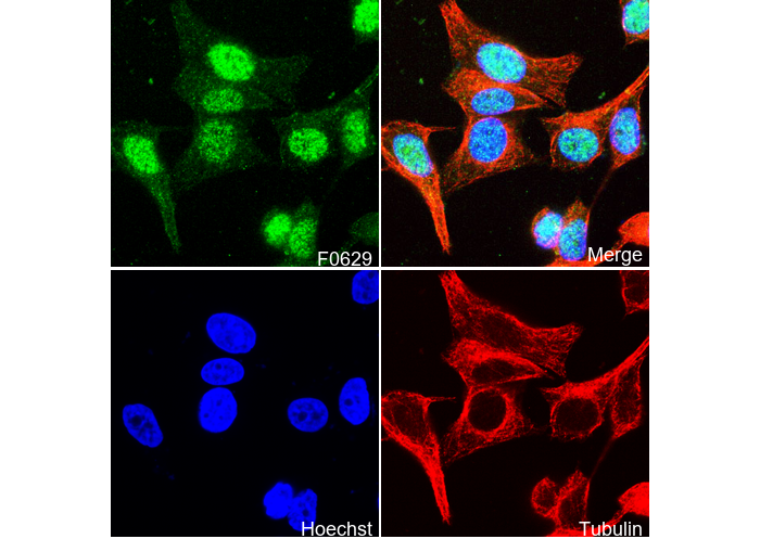 • Immunofluorescent analysis of MCF-7 cells using F0629 (green, 1:50), Hoechst (blue) and tubulin (Red).