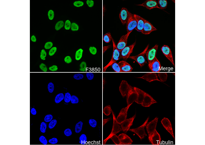 • Immunofluorescent analysis of MCF-7 cells using F3850 (green, 1:250 ), Hoechst (blue) and tubulin (Red).
