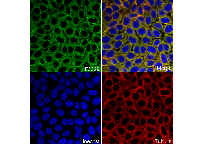• Immunofluorescent analysis of BxPC-3 cells using F3329 (green, 1:100), Hoechst (blue) and tubulin (Red).