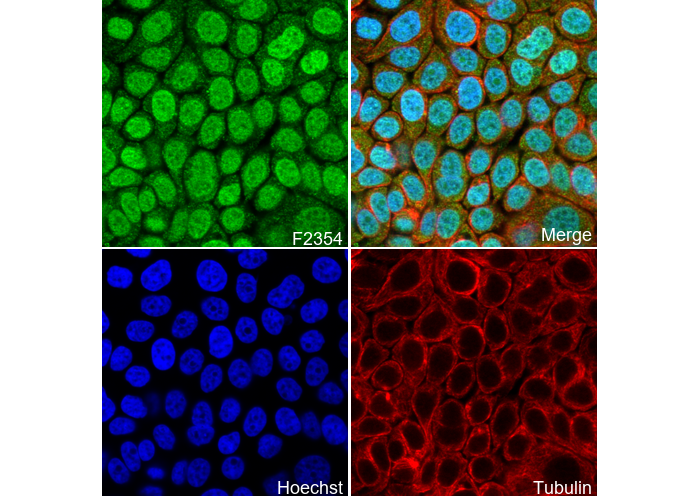 • Immunofluorescent analysis of A431 cells using F2354 (green, 1:100), Hoechst (blue) and tubulin (Red).
