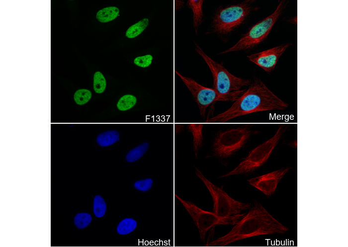 • Immunofluorescent analysis of Hela cells using F1337 (green, 1:200), Hoechst (blue) and tubulin (Red).