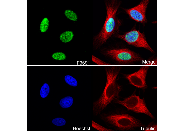 • Immunofluorescent analysis of Hela cells using F3691 (green, 1:100), Hoechst (blue) and tubulin (Red).
