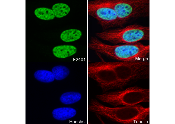 • Immunofluorescent analysis of Hela cells using F2401 (green, 1:500), Hoechst (blue) and tubulin (Red).