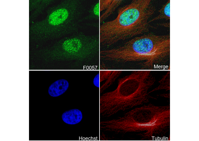 • Immunofluorescent analysis of Hela cells using F0057 (green, 1:200), Hoechst (blue) and tubulin (Red).