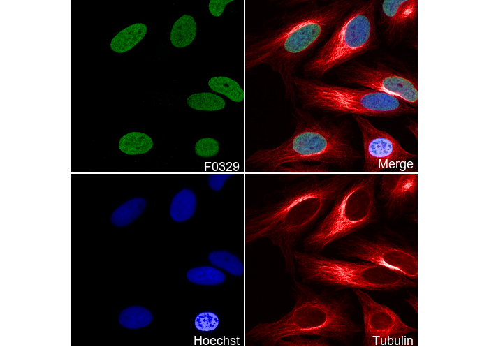 • Immunofluorescent analysis of Hela cells using F0329 (green, 1:800), Hoechst (blue) and tubulin (Red).