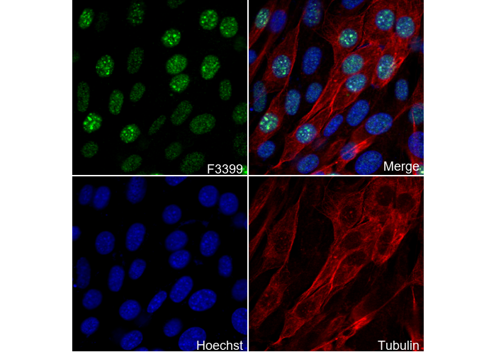 • Immunofluorescent analysis of NIH/3T3 cells using F3399 (green, 1:500), Hoechst (blue) and tubulin (Red).