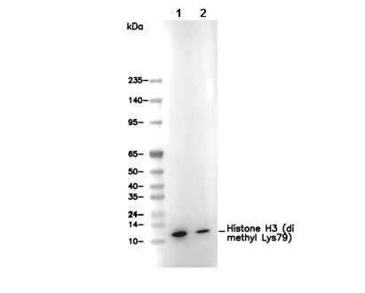Histone H3 (di methyl Lys79) Antibody [K1L16] recognizes endogenous levels of histone H3 only when di-methylated on Lys79.