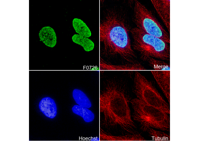 • Immunofluorescent analysis of Hela cells using F0726 (green, 1:100), Hoechst (blue) and tubulin (Red).