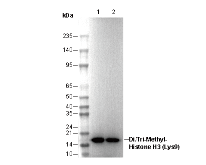 Histone H3 (di/tri methyl Lys9) Antibody [C19M14] detects endogenous levels of histone H3 when di- or tri-methylated on Lys9. The antibody also shows slight cross-reactivity with histone H3 when mono-methylated on Lys9. The antibody does not cross-react with methylated histone H3 Lys4, Lys27, Lys36 or Lys79.