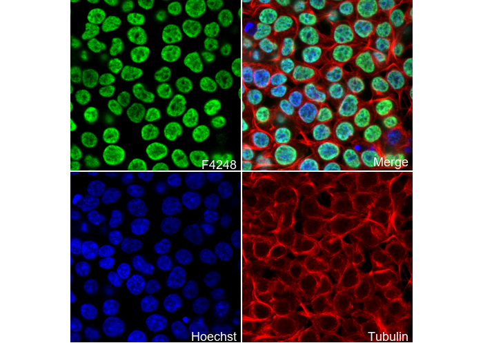 • Immunofluorescent analysis of U2OS cells using F4248 (green, 1:3200), Hoechst (blue) and tubulin (Red).