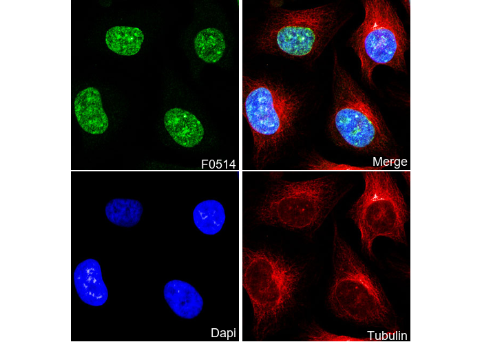 • Immunofluorescent analysis of Hela cells using F0514 (green, 1:400), Hoechst (blue) and tubulin (Red).