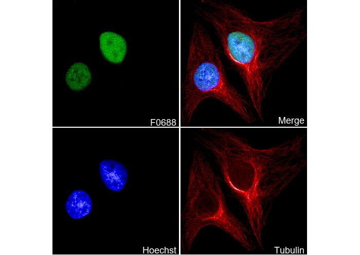 • Immunofluorescent analysis of Hela cells using F0688 (green, 1:200), Hoechst (blue) and tubulin (Red).