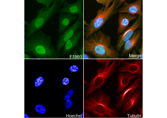 • Immunofluorescent analysis of Hela cells using F1960 (green, 1:6400), Hoechst (blue) and tubulin (Red).