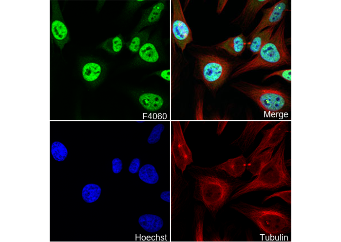 • Immunofluorescent analysis of Hela cells using F4060 (green, 1:2000), Hoechst (blue) and tubulin (Red).