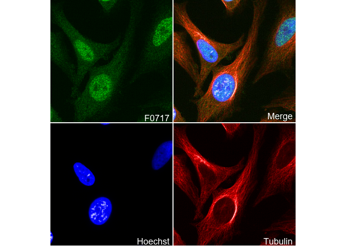 • Immunofluorescent analysis of Hela cells using F0717 (green, 1:200), Hoechst (blue) and tubulin (Red).