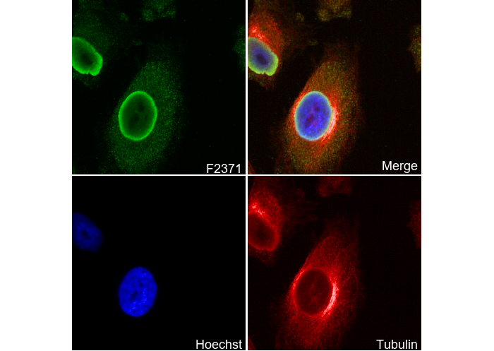 • Immunofluorescent analysis of Hela cells using F2371 (green, 1:50), Hoechst (blue) and tubulin (Red).