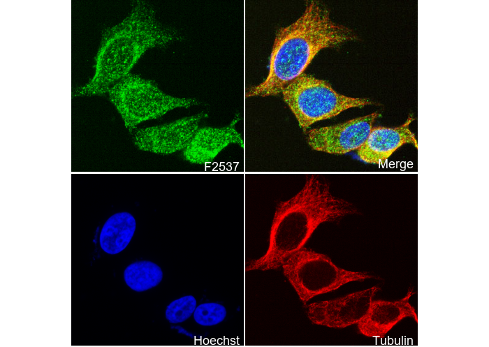 • Immunofluorescent analysis of MCF-7 cells using F2537 (green, 1:100), Hoechst (blue) and tubulin (Red).