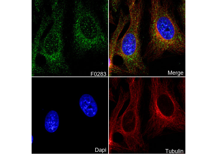 • Immunofluorescent analysis of Hela cells using F0283 (green, 1:50), Hoechst (blue) and tubulin (Red).