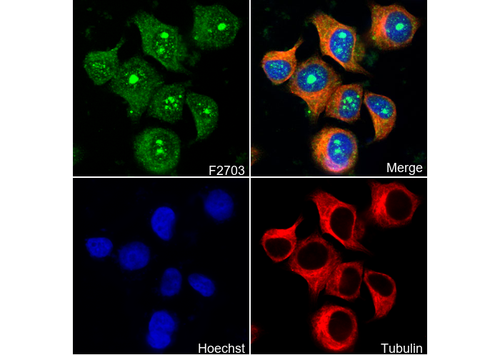 • Immunofluorescent analysis of HepG2 cells using F2703 (green, 1:50), Hoechst (blue) and tubulin (Red).