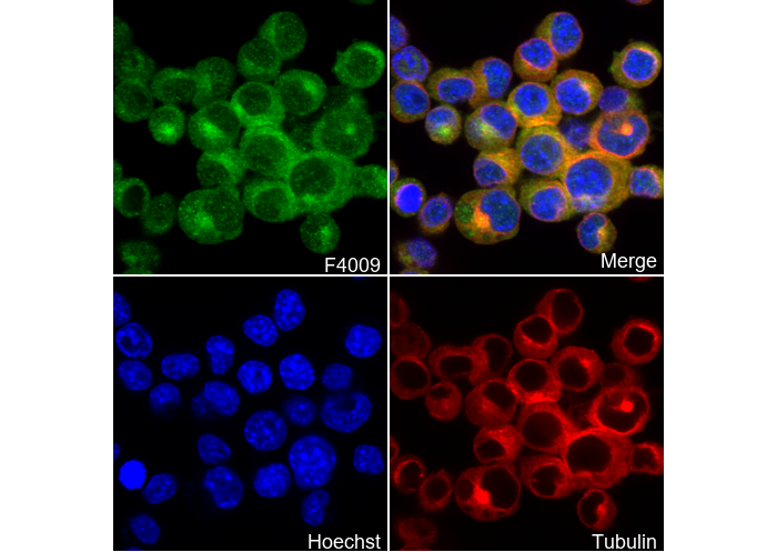 • Immunofluorescent analysis of Neuro-2a cells using F4009 (green, 1:1500), Hoechst (blue) and tubulin (Red).