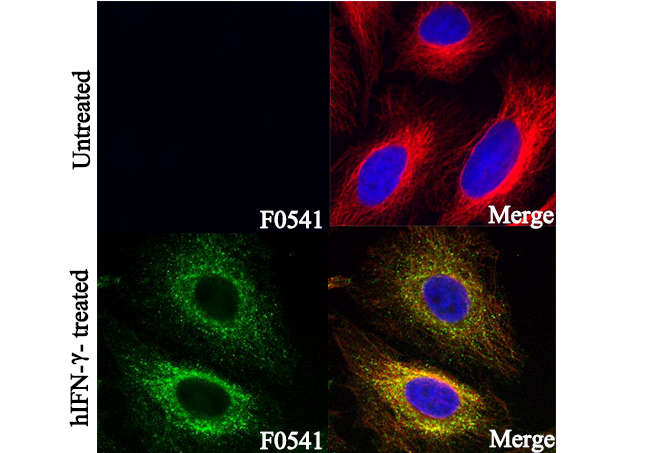 • Immunofluorescent analysis of Hela cells, untreated (upper) and treated with hIFN-γ (10 ng/ml, overnight)(lower), using F0541 (green, 1:100), Hoechst (blue) and tubulin (Red).