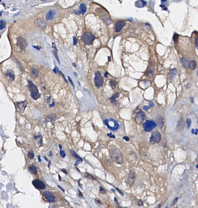 • Immunohistochemical analysis of formalin fixed paraffin embedded human Lung adenocarcinoma tissue with F0541 at 1/100 dilution.