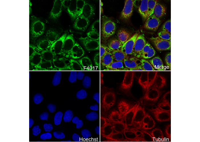• Immunofluorescent analysis of Caco-2 cells using F4017 (green, 1:50), Hoechst (blue) and tubulin (Red).