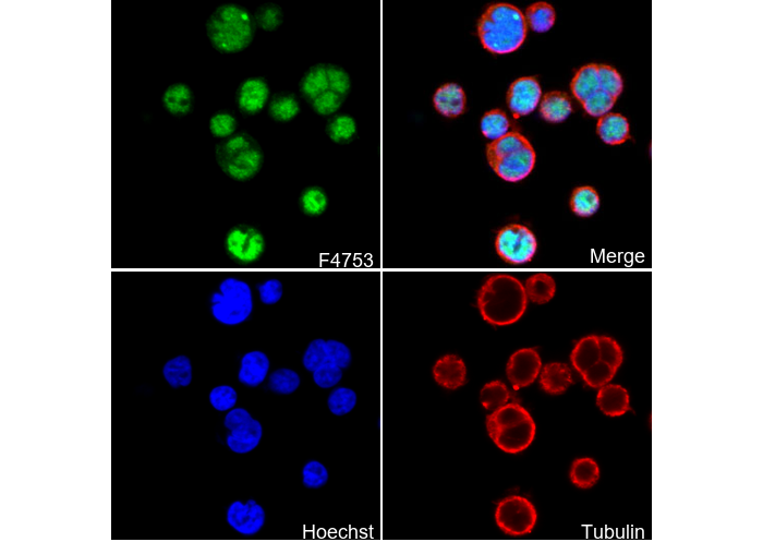 • Immunofluorescent analysis of Jurkat cells using F4753 (green, 1:100), Hoechst (blue) and tubulin (Red).