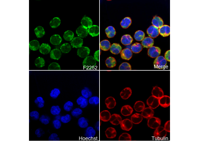 • Immunofluorescent analysis of MOLT-4 cells using F2252 (green, 1:200), Hoechst (blue) and tubulin (Red).