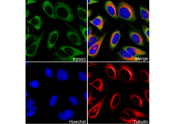 • Immunofluorescent analysis of Hela cells using F2993 (green, 1:50), Hoechst (blue) and tubulin (Red).