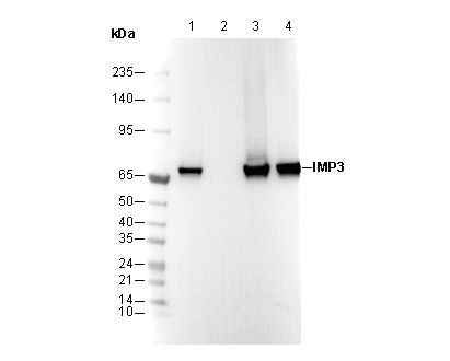 • Lane 1: HAP1, Lane 2: HAP1 (KO IMP3), Lane 3: HeLa, Lane 4: HEK293