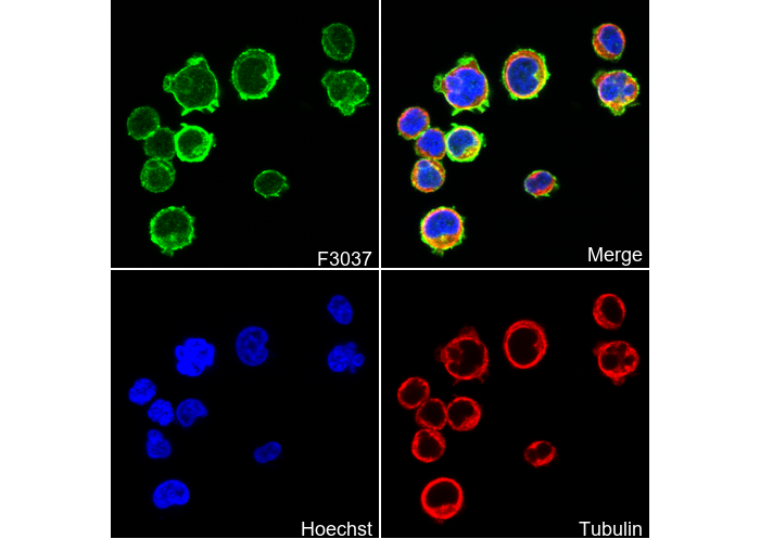 • Immunofluorescent analysis of Jurkat cells using F3037 (green, 1:200), Hoechst (blue) and tubulin (Red).