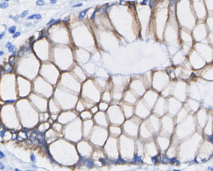 • Immunohistochemical analysis of formalin fixed paraffin embedded human Colorectal cancer tissue with F1452 at 1/100 dilution.