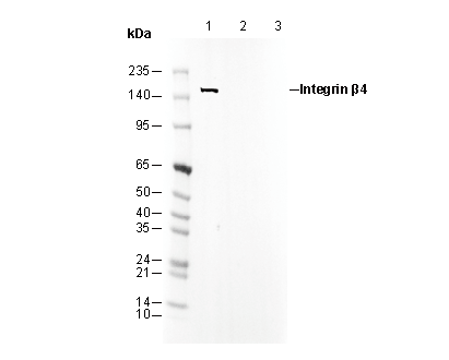 Integrin β4 Antibody [K14D22] recognizes endogenous levels of total integrin β4 protein.
