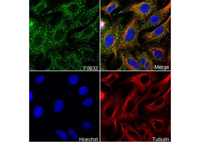• Immunofluorescent analysis of A549 cells using F0632 (green, 1:1600), Hoechst (blue) and tubulin (Red).