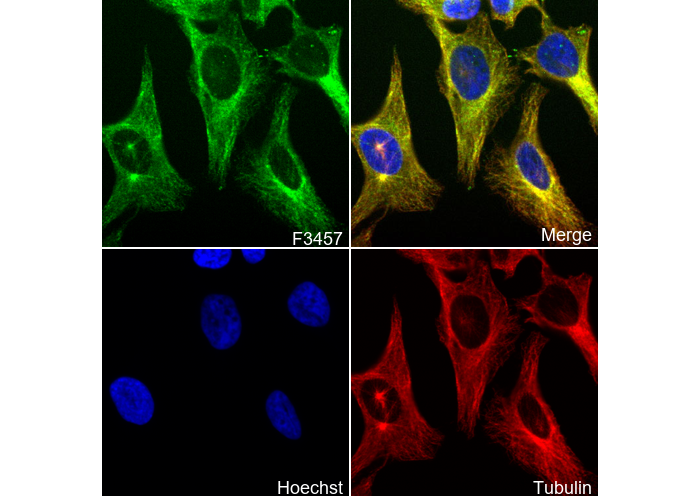 • Immunofluorescent analysis of Hela cells using F3457 (green, 1:100), Hoechst (blue) and tubulin (Red).