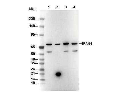 • Lane 1: THP-1, Lane 2: THP-1 (KO IRAK4), Lane 3: U937, Lane 4: U-87 MG