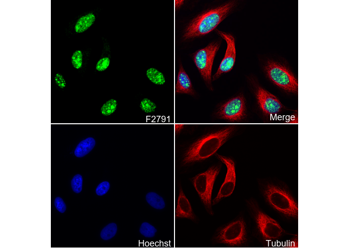 • Immunofluorescent analysis of Hela cells using F2791 (green, 1:100), Hoechst (blue) and tubulin (Red).