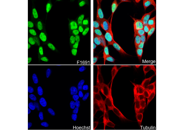 • Immunofluorescent analysis of SH-SY5Y cells using F1691 (green, 1:250), Hoechst (blue) and tubulin (Red).